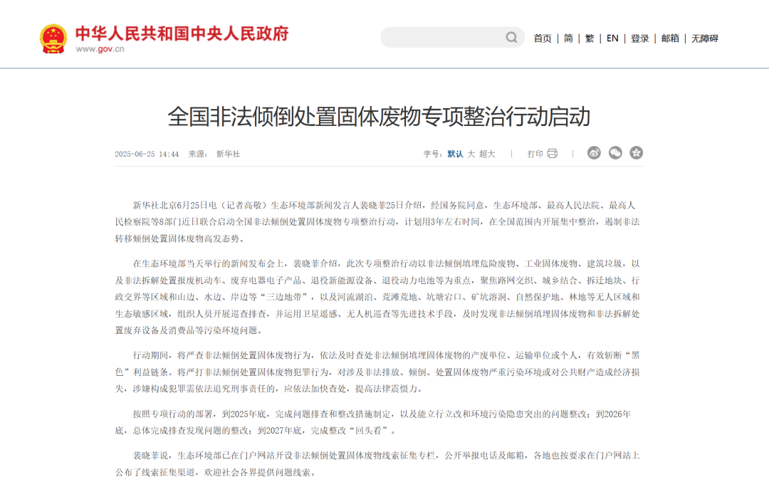 根据《全国非法倾倒处置固体废物专项整治行动方案(2025—2027年)》,计划通过3年左右时间的集中整治,有效遏制非法转移倾倒处置固体废物的高发态势。具体目标为:到2025年底,完成问题排查和整改措施制定,以及能实现立行立改和环境污染隐患突出问题的整改;到2026年底,完成90%以上问题整改;到2027年底,完成整改“回头看”,巩固成效防止反弹。